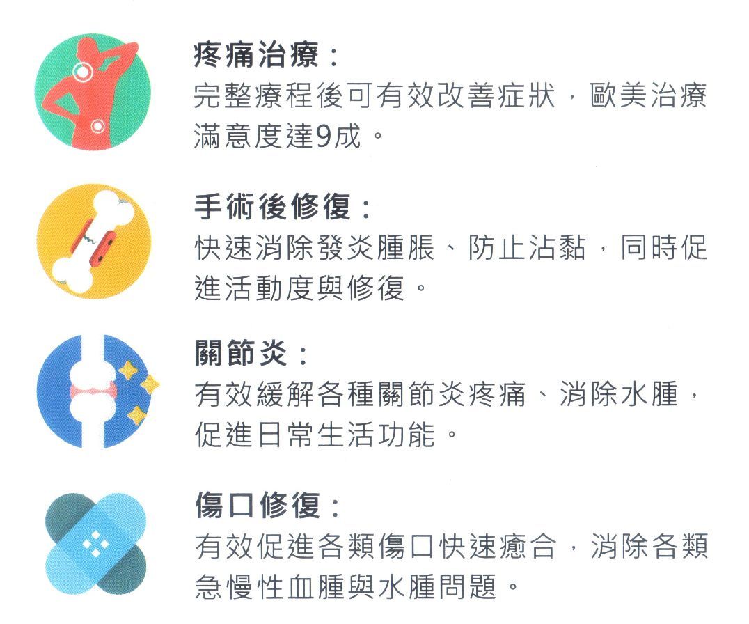 第一次治療即可感受到炎症、水腫和疼痛的改善。臨床研究顯示,第4次或第5次治療可使疼痛和炎症减輕50%以上,進而提升生活品質。